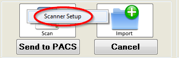 - Or, if you've configured a functioning "Mode" in DocScanFx, run DocScanFx, select a mode, perform a query, choose an exam to scan images into, and right click the "Scan" button. Finally, click the "Scanner Setup" option.