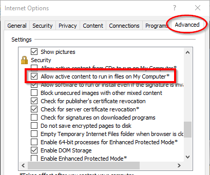 - Open Internet Explorer, click “Tools”, then “Internet Options”, then go to the “Advanced” tab and scroll down to the “Security” section and check “Allow active content to run in files on My Computer”. Then restart Internet Explorer and test again.