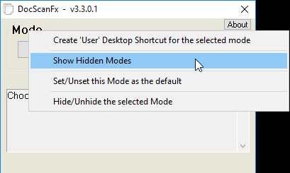 - Test out example modes: On the first DocScanFx Mode selection screen, right click the word "Mode" and use the context menu to show some extra hidden modes you can test out. Other options in the context menu will allow you to permanently unhide select modes.